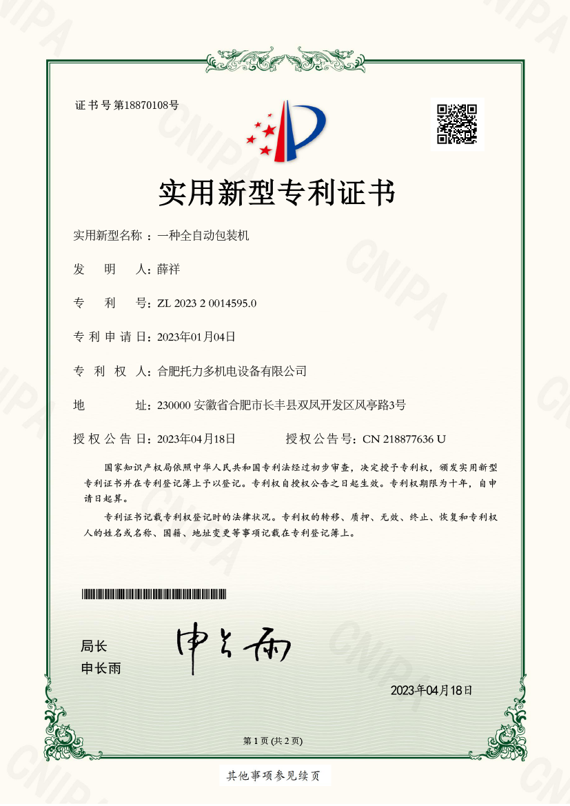 全自動(dòng)包裝機-專(zhuān)利證
