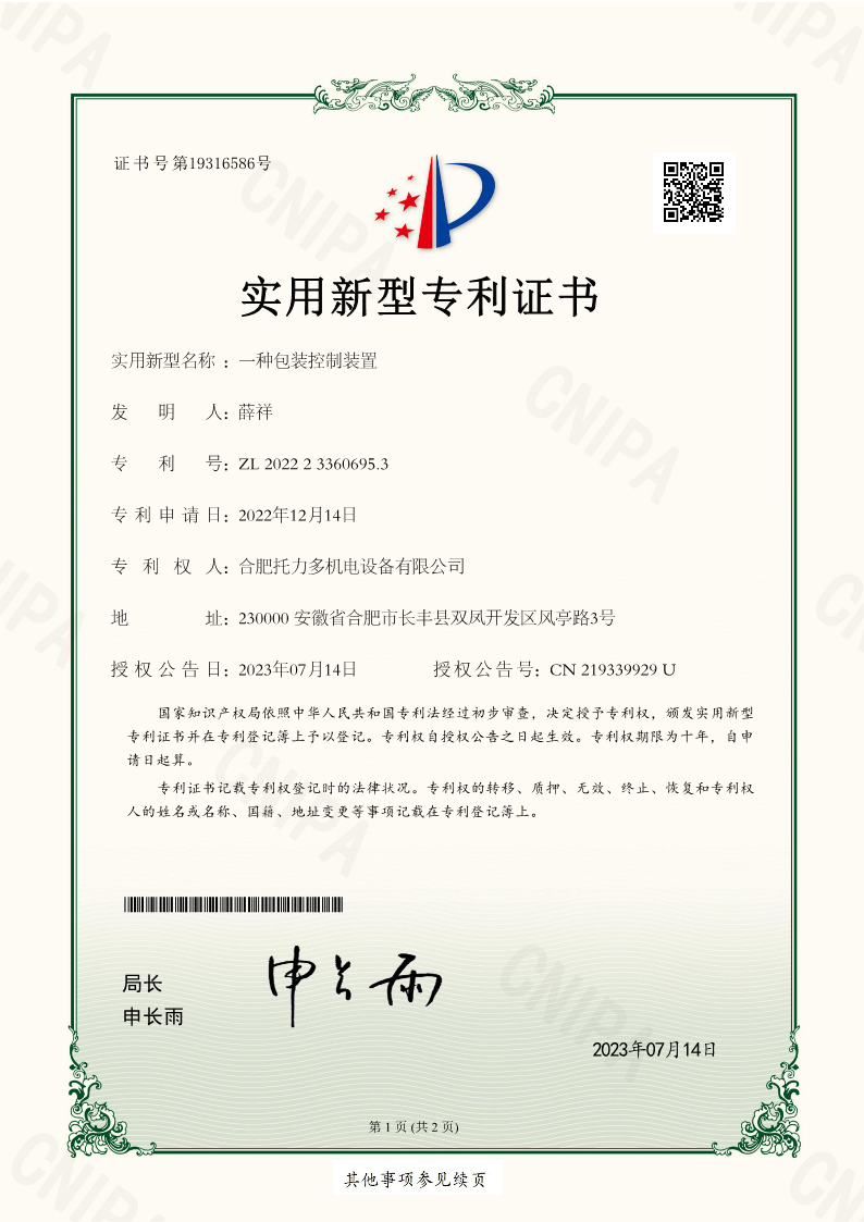 包裝控制裝置-專(zhuān)利證