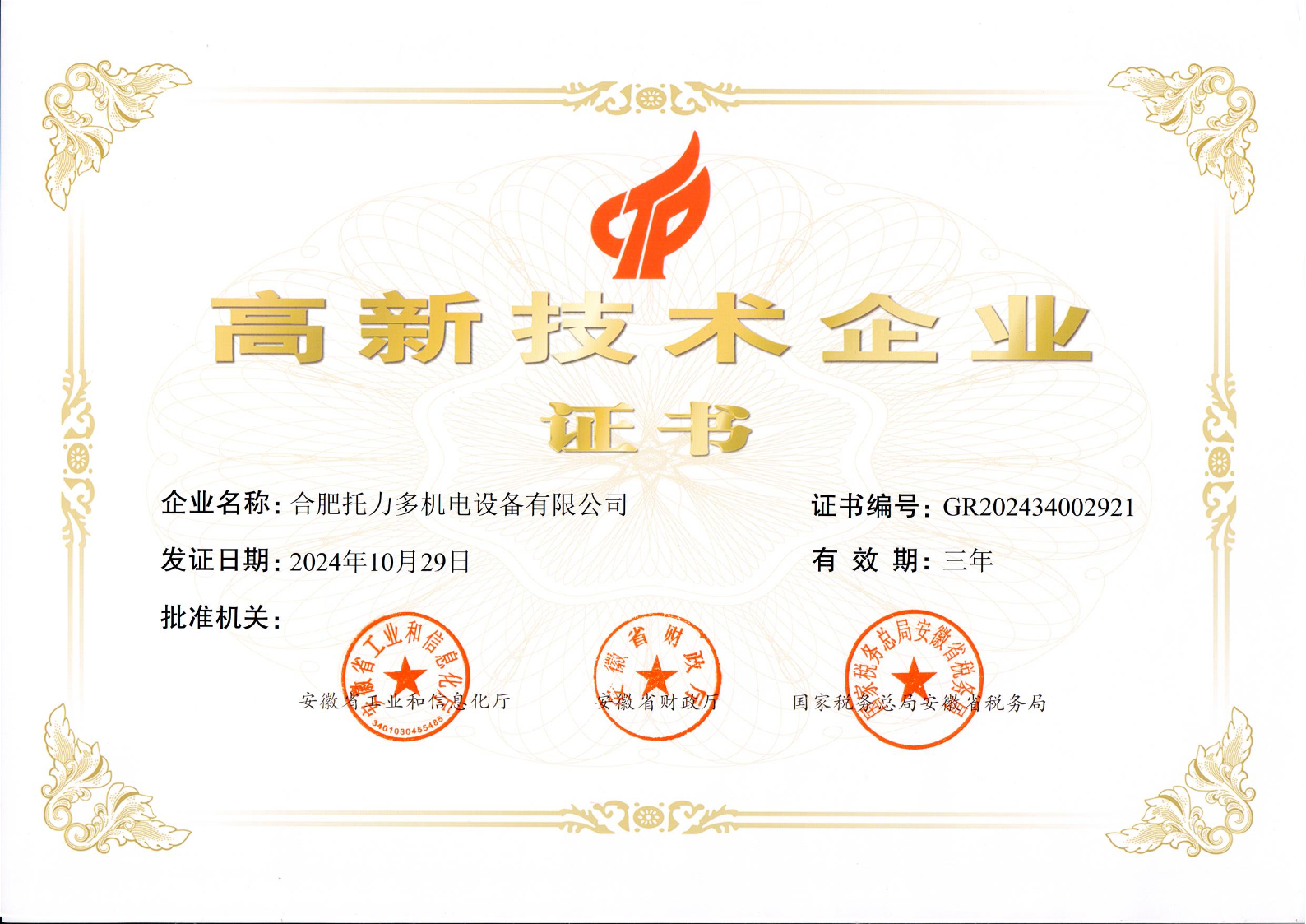 高新技術(shù)企業(yè)證書(shū)